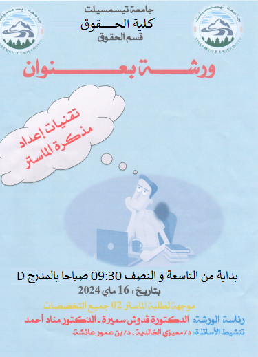 ورشة بعنوان تقنيات إعداد مذكرة ماستر @إعلانات للطلبةإعلان مهم بواسطة admin faculté droit في مايو 14, 2024 545 شارك 545 شارك FacebookTwitterGoogle+ReddItWhatsAppPinterestالبريد الإلكتروني